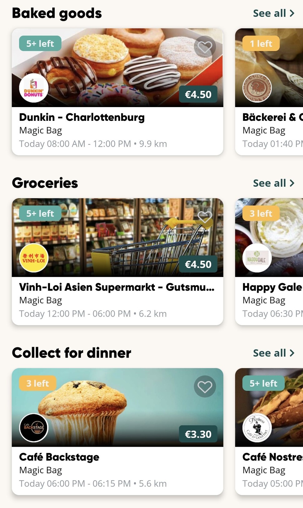 서플러스는 2017년 환경운동가 라파엘 펠머와 엔지니어 마르틴 스호르트가 “음식물을 쓰레기통에서 구하라!”는 구호를 내세워 창업한 스타트업이다. 물론 대형마트에 비하면 아주 작은 규모지만 “식품 유통기한은 참고치일 뿐”이라거나, “먹을 수 있는 음식은 판매해야 한다”는 그들의 주장은 반향이 컸다. 반듯하지 않은 음식은 무조건 버리기로 한 우리의 결정은 온당했던 것일까?프랑스에서는 2016년부터 슈퍼마켓에서 식료품을 폐기처분하지 못하도록 하는 법이 시행됐다. 대형 슈퍼마켓은 6개월마다 유통기한이 임박한 음식물을 대량폐기한다. 유럽연합에서는 유통기한을 적지 않아도 되는 식료품을 늘리고 적는 방식도 고치는 새로운 규정을 검토하고 있다. ‘버려지는 음식을 구하라’라는 목소리는 서플러스뿐 아니라 유럽 곳곳에서 커지고 있다. 2020년 4월엔 스웨덴 스타트업 모타토스(Motatos)도 ‘음식물 구조’를 내걸고 독일에서 판매를 시작했다. 2019년 덴마크에서 시작한 모타토스는 유통기한이 지나 폐기되는 식품과 생활용품을 대량으로 헐값에 온라인에서 판매한다. 또 식당에서 팔다 남은 음식을 싸게 판매하는 앱 ‘투굿투고’(Too Good To Go)에서도 음식을 주문하면 “음식을 구해주셔서 고맙습니다” 하는 메시지를 받는다. ‘음식물 구조 앱’이라고도 하는 투굿투고는 2015년 덴마크에서 뷔페 음식이 남아 버려지는 것을 막기 위해 고안됐던 앱이다. 지금은 유럽 13개국에서 서비스 중이다. 앱에서 자신이 사는 지역을 누르면 투굿투고에 등록한 근처 식당에서 팔다 남은 음식이 무엇이 있는지 볼 수 있다. 앱에서 미리 결제하고 가게에 가서 음식을 받아오는 방식이다. 식당뿐 아니라 여러 유기농 전문 슈퍼마켓이나 대형마트 등이 이 앱에 팔다가 남은 신선식품을 올린다. 가장 많이 팔리는 상품은 ‘매직백’이라고 부르는 판매자가 남은 식료품을 모아서 파는 것인데, 보통 3~5유로(약 4500~6천원)를 내면 종이가방 하나 가득 빵과 채소, 과일, 파스타 등 1인 가구라면 2~3일은 먹을 만한 식량을 받는다.