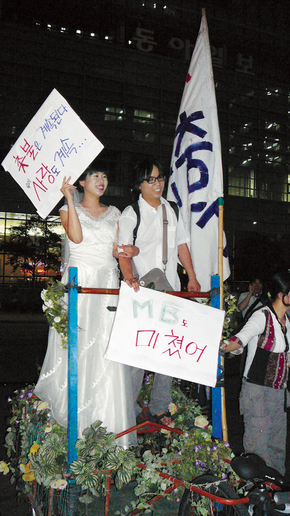 7월18일 금요일 저녁 8시. 서울 청계광장에 자전거 꽃마차가 나타났다. 2인용 자전거에 꽃으로 장식된 수레가 매달린 꽃마차에는 하얀 웨딩드레스를 입은 한경애(32)씨와 턱시도를 입은 김홍진(28)씨가 타고 있었다. 이들은 “촛불은 계속된다. 사랑도 계속…” “MB도 미쳤어”라는 피켓을 들었다.