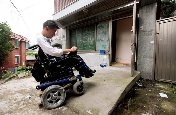 서울 용산구 청파동 한 다가구 주택에 올해 4월 세들어 간 김현주(36)씨. 그는 셋방 문을 넘어서기까지 ‘20전21기’의 사투를 벌여야 했다. 팔다리를 쓰지 못하고 언어장애까지 있는 그에게 현관 문턱부터 사람들의 편견의 턱까지 이 세상은 온통 ‘턱’ 투성이였다. 그 어느 하나 호락호락하지 않은….