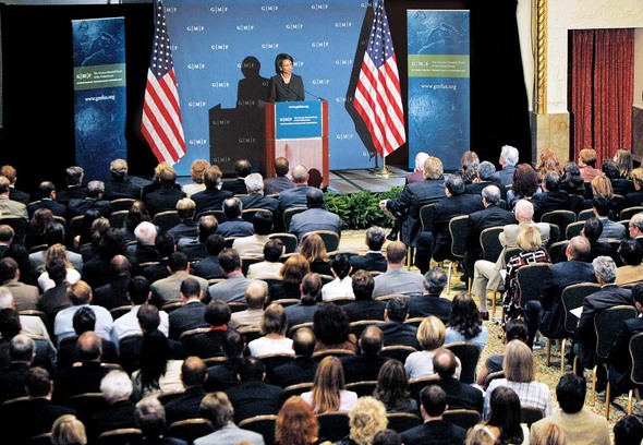기자회견을 하는 콘돌리자 라이스 미 국무장관. 연합/ AP PHOTO/ GERALD HERBERT
