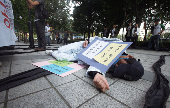 HIV 감염인 윤가브리엘씨가 10월7일 열린 집회에서 에이즈 약을 구하지 못해 쓰러진 환자들을 상징하는 퍼포먼스를 벌이고 있다.