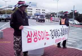 회사는 지난 9월 중순께까지 전적 동의서 작성을 거부하던 MD 사업부 소속 노동자 120여 명을 충남 천안공장으로 발령냈다. 전적이 싫다면 2차 전지 사업을 확대 개편할 천안공장으로 옮겨주겠다는 명목이었다. 원하는 사람은 3년 안에 다시 부산공장으로 돌아올 수 있을 것이라는 언질도 건넸다. 고용 불안을 느낀 노동자들은 문서로 약속해줄 것을 요구했지만, 이런 바람은 받아들여지지 않았다. 이런 과정에서 회사를 불신하게 된 노동자들 중 일부가 천안공장 발령을 거부하고 금속노조 가입을 선언하게 된 것이다. 21년째 근무해온 김동선씨는 “10~20년간 부산에서 삶의 터전을 닦아온 사람들에게 갑자기 천안으로 옮기라고 하면 어떡하나. 더구나 나는 어머니가 항암 치료 중이어서 천안에 갈 수 없는 형편”이라고 호소했다. 전배 뒤 ‘신설 합작법인으로 가라’는 지시받아 그렇다면 노동자들이 고용 보장이 된다는 회사의 구두 약속을 신뢰하지 못하는 까닭은 무엇일까. 한 노동자는 “부산사업장 공장장이 고용보장에 대한 담화문을 발표했다지만, 2000년대 들어서 오랜 구조조정 과정을 겪다 보니 회사를 신뢰하기 어렵게 됐다”고 말한다. 김동선씨의 사례를 보자. 지난해 CRT 부문이 정리되면서 회사는 직원들에게 명예퇴직, 관계사 전출, 다른 품목 사업장으로의 전배 등 가운데 하나를 선택하게 했다. 어머니가 암 선고를 받은 상태였던 김씨는 MD 부문으로의 전배를 신청했고, 한국폴리텍대학(옛 기능대학)에서 3개월 교육을 마친 뒤 지난 4월 현장에 배치됐다. 그리고 다섯 달 뒤 ‘무조건 신설 합작법인으로 가라’는 일방적 지시를 받게 되니 ‘장기 근속자 물갈이’의 희생양이 될 것이라는 확신이 들었다는 것이다. CRT 부문 정리에 따라 사내 하청업체들이 계약 해지된 지난해 2월 이후 부산사업장 인근에서 항의집회를 이어가는 현실은 고용 불안이 남의 일이 아님을 보여주는 증거다. 과거 삼성SDI의 정규직 사원이었던 이들 중 상당수가 외환위기 이후 소사장제 형태의 사내 기업으로 옮겨갔는데, 이 사내 기업들이 계약 해지되거나 폐업 처리되면서 졸지에 일자리를 잃었다. 익명을 요청한 삼성SDI의 한 노동자는 “처음엔 그분들도 55살까지 고용이 보장된다는 공장장의 서명·약속을 받고 보상금을 받은 뒤 외주로 전환됐다”면서 “이분들의 투쟁 과정을 봐왔기 때문에 대표이사 직인이 있는 고용 보장 문서 약속을 요구하고 있는 것”이라고 밝혔다. 대개 사내 하청업체들 직원의 평균 월급여는 140만~150만원 수준으로, 삼성SDI 정규직의 절반에도 못 미친다.