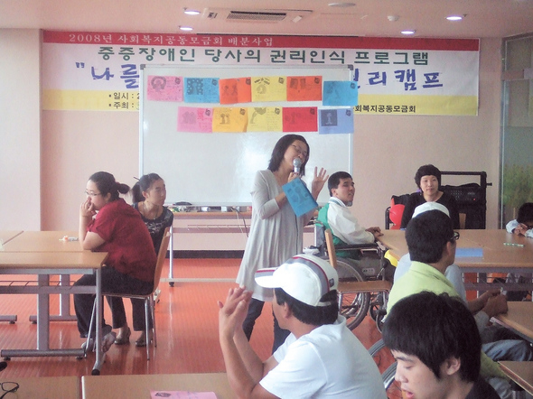 휠체어를 탄 장애인의 출입을 막는 식당 앞에서 어떻게 대차게 ‘싸울’까? ‘바쁜 점심시간에 식당에서 밥 먹기’는 싸우지 않고도 누릴 수 있어야 하건만, 웬만큼 싸워서는 맛보기 어려운 권리다. 차별이 공기처럼 둘러싸인 장애인에게, 권리를 주장하는 장애인에게 이런 일은 일상다반사! 마트에서 장을 보고, 은행에서 통장을 만들며, 병원에서 진료를 받을 때 상대방의 말·눈빛·태도에서 묻어나는 차별은 일일이 열거하기도 어렵다. 차별 사례를 역할극으로 구성해 ‘대처 방법’을 고민하던 참여자들은 곧 싸울 수 있는 권리의 주체인 자신을 확인하게 된다. 이어서 “우리가 직접 말해야 하고 나서야 한다니까요!”라고 분노하는 어떤 장애인 참여자의 ‘선동’으로 분위기는 한껏 달아올랐다.