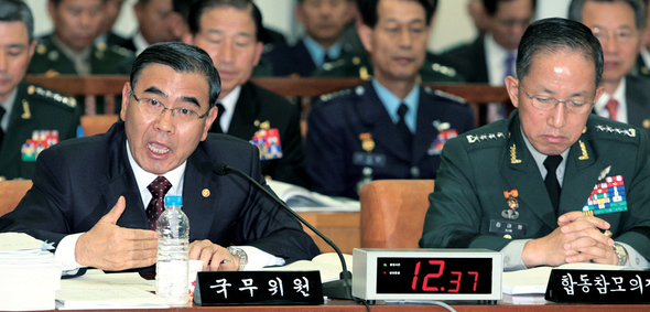 이상희 국방부 장관(왼쪽)이 지난 10월23일 열린 국정감사에서 군 법무관들의 헌법소원 제기와 관련한 질의에 답하고 있다. 군은 여전히 규율과 처벌의 시각에서 이번 문제에 접근하고 있다. 한겨레 강창광 기자.