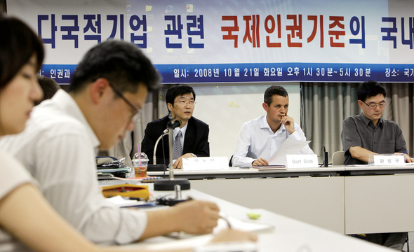 ‘고삐 풀린 다국적 자본에 재갈을 물리자!’ 10월21일 국제민주연대가 주최한 워크숍에서 참석자들이 다국적 기업의 사회적 책임과 국제인권기준에 대해 토론을 벌이고 있다. <한겨레21> 김정효 기자