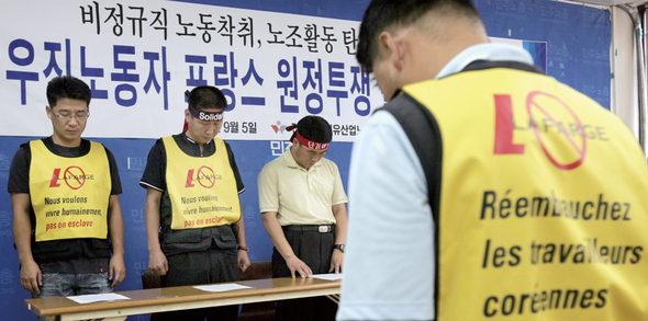 프랑스계 라파즈의 부당노동 행위에 항의해 라파즈한라시멘트 사내 하청업체 노동자들이 파리 원정투쟁 선포식을 하고 있다. 한겨레 이종근 기자