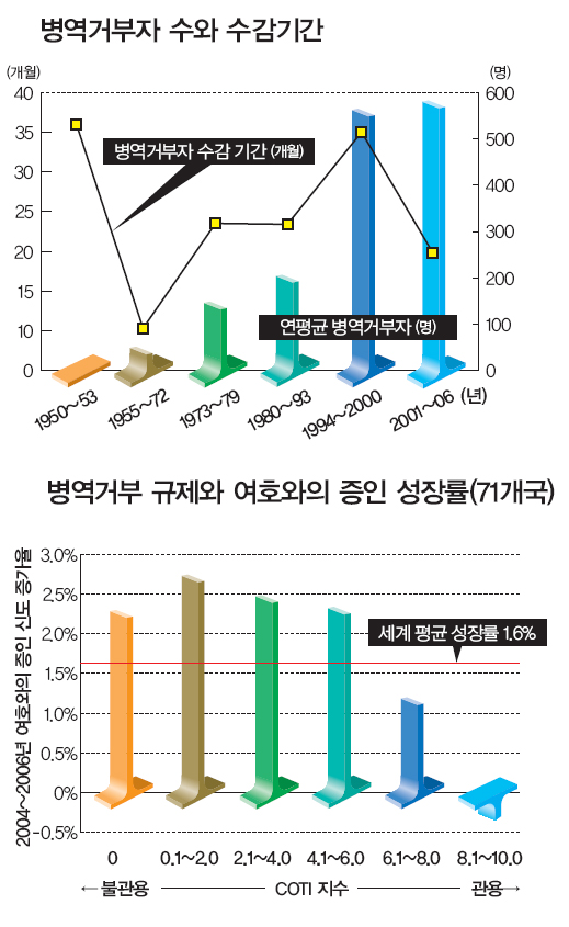 병역거부자 수와 수감기간 / 병역거부 규제와 여호와의 증인 성장률(71개국)