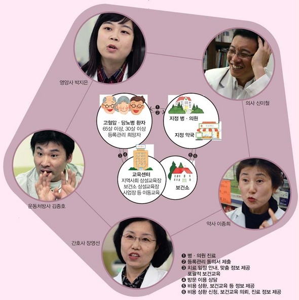 이 사업의 핵심은 의사와 약사, 간호사, 영양사, 운동처방사 등 다양한 전문가가 터놓고 협력한다는 점이다. 병·의원에서 의사의 진료와 처방을 받고 약사의 복약 지도를 받은 뒤 교육센터로 가면 영양사가 식단을, 운동처방사가 운동방법을 알려준다. 간호사는 혈압과 혈당을 재고 관리하는 법을 설명한다. 이 완벽한 공조 속에서 환자는 최상의 관리를 받게 된다.