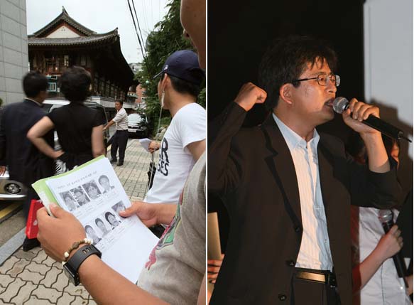 농성 기간 내내 경찰은 조계사 주변을 둘러싸고 삼엄한 감시를 펼쳤다(왼쪽). 지난 8월5일, 서울 시청 앞 광장에서 열린 촛불문화제에서 박원석 상황실장이 시민들 앞에서 이야기하고 있다. 한겨레 김진수·이종근 기자(왼쪽부터).
