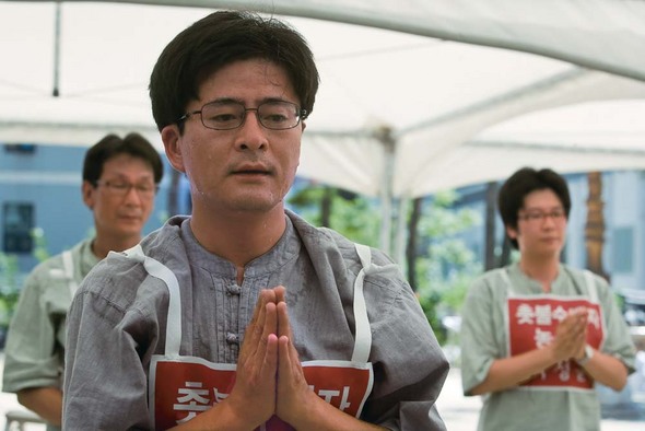 조계사 농성 시절, 박원석 실장을 비롯한 수배자들은 매일 미 쇠고기 재협상을 촉구하고 경찰의 폭력 진압을 규탄하는 108배를 했다. 조계사 농성 돌입 직후인 지난 7월9일 농성자들이 108배를 하는 모습. <한겨레21> 박승화 기자