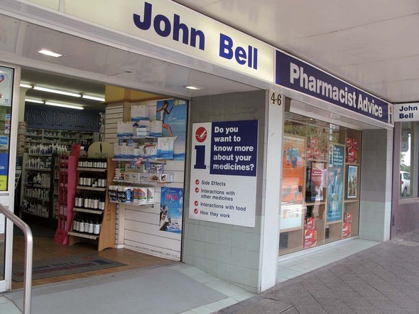 ‘존 벨 약사의 조언’ 간판이 달린 약국 외부 전경. 완만한 경사로의 입구가 눈에 띈다.