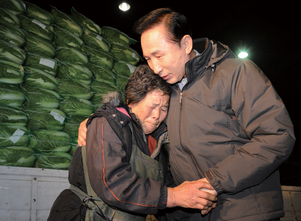 이명박 대통령이 4일 새벽 서울 송파구 가락동 농수산물시장을 방문해 노점에서 우거지를 팔던 상인이 울먹이자 위로하고 있다. 청와대사진기자단