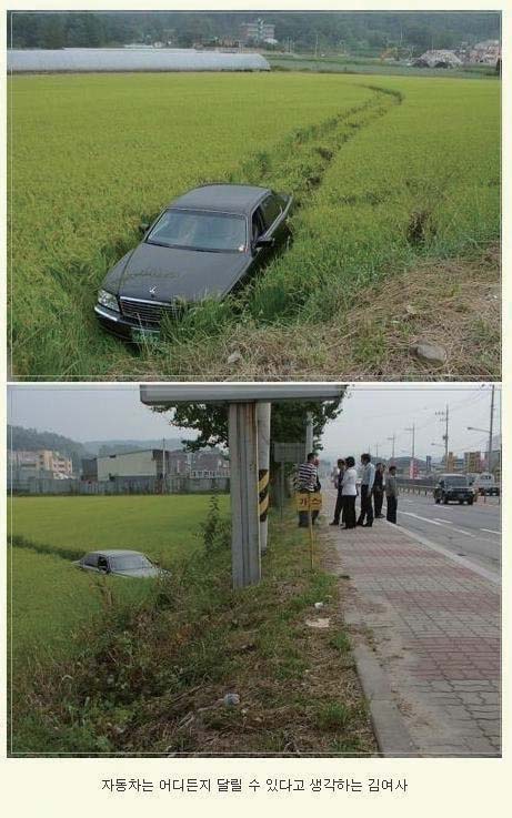 이처럼 2년 전 게시판에서 사랑받았던 김여사가 최근 유머 게시판에서 다시 뜨고 있다. 다음 아고라 ‘즐보드’에 황당한 자동차 사진이 잇따라 올라왔다. 고급 승용차 1대가 높은 보도블록에 차체가 걸려 꼼짝 못하고 있는 사진, 사이드미러를 접고 도로를 질주하는 승용차 사진 등이다. 누리꾼들은 ‘강남 김여사님의 굴욕’이나 ‘김여사는 사이드미러를 장식으로 달고 디닌다’는 댓글을 달며 키득거렸다. 이때부터 옛날 사진들을 재탕하거나 새로운 사진들이 추가되면서 김여사 시리즈는 점점 살이 붙었다. 사진 속 김여사의 모습은 기상천외하다. 사이드미러에 손가방을 걸고 달리고, 아이들을 트렁크에 태우거나 심지어 등에 업고 운전대를 잡는다. 논에 처박힌 승용차 사진에는 ‘차는 어디든지 달릴 수 있다고 생각하는 김여사’라는 설명이 붙었다. 물론 일부는 합성의 증거를 들이대며 “속지 말자”고 주장한다.