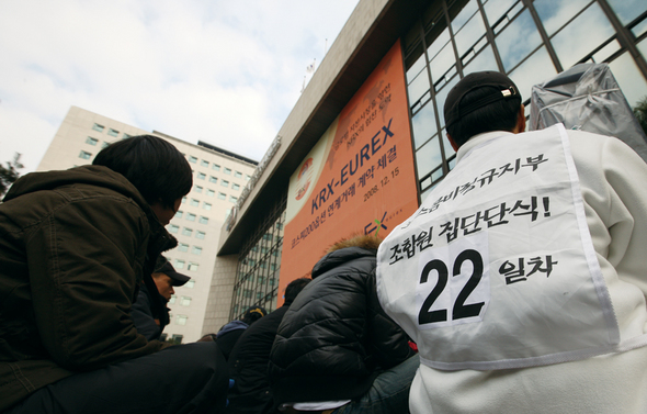 서울 여의도 증권선물거래소 앞을 지나는 자동차들의 소음이 쉴 새 없이 코스콤 비정규 노동자들의 천막농성장 안을 비집고 들어왔다. “처음엔 시끄러워서 잠도 못 잤는데 1년 넘게 소음에 시달리다 보니 이젠 익숙해졌어요.” 12월16일 단식농성 22일째를 맞은 황병화(27)씨가 천막 바닥을 가리키며 멋쩍게 웃었다. “버스가 지나가면 이렇게 땅이 흔들리기도 해요.”