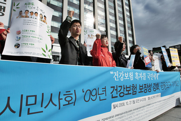 보건·의료 관련 시민단체들로 구성된 건강연대 회원들이 2008년 10월27일 서울 계동 보건복지부 앞에서 “건강보험 누적흑자를 중증질환자 등의 보장성을 강화하는 데 써야 한다”고 주장하고 있다. 한겨레 김명진 기자