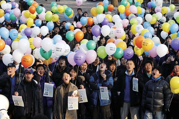 전국언론노동조합 소속 언론인들이 지난 1월5일 서울 남산에서 한나라당이 제출한 언론관계법의 문제점을 알리는 풍선을 날려보내고 있다. <한겨레21> 김정효 기자