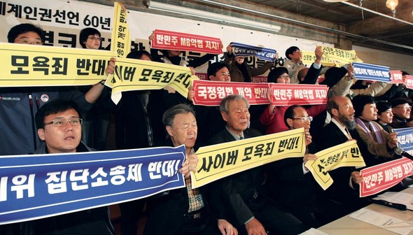 한나라당이 도입하려는 사이버모욕죄는 온라인에 대한 가중처벌 논란에서 자유롭지 못하다. 지난해 12월10일 민생민주국민회의 등 소속 회원들이 서울 정동 프란치스코 회관 앞에서 ‘사이버모욕죄 반대’ 등의 내용을 내걸고 시위하고 있다. 한겨레 김진수