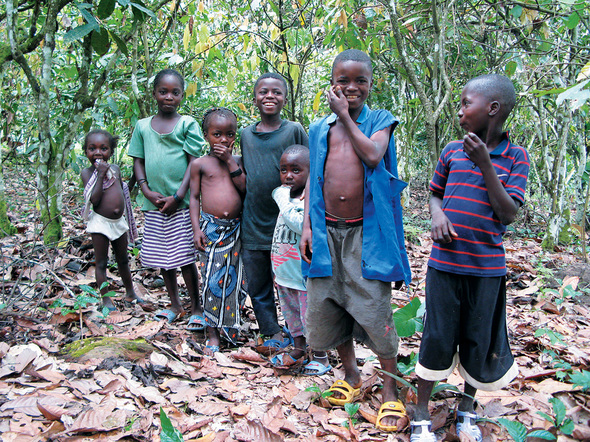 코트디부아르 미야기주 시니코송 마을에 사는 어린이들이 카카오 밭에서 웃고 있다. 10살 안팎의 이 어린이들은 6살 무렵부터 학교를 가는 대신 카카오를 재배하는 부모를 도와 일을 한다.
