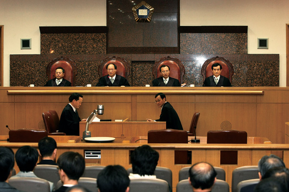 신영철 대법관(맨 오른쪽) 등 대법원 3부 대법관들이 지난 3월12일 오후 서울 서초동 대법원 제2법정에서 윤두환 한나라당 의원의 공직선거법 위반 혐의 등에 대한 선고공판을 진행하고 있다. 사진 <한겨레> 이정아 기자