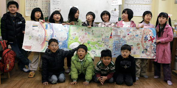 초등 대안학교인 수원칠보산자유학교 3학년 13명의 아이들이 작은 교실에서 둘러앉아 쉴 새 없이 조잘댔다. 3월11일 수요일 오후 2시 미술 시간, 이날은 ‘내가 살고 싶은 세상’이란 주제로 공동작업을 하는 수업이 한창이었다.