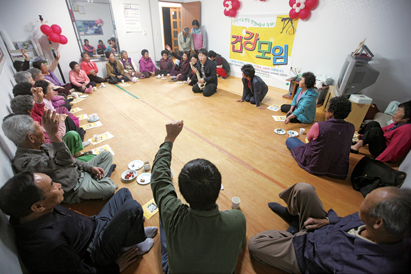 4월23일 저녁 7시30분, 임승현 한의사는 주민들에게 ‘허리 건강법’을 알리려고 안성시 사곡동 마을회관을 찾았다. 안성의료생협이 매달 12개 지역에서 여는 ‘건강 모임’이다. 병원 업무를 끝내고 달려가야 하고 추가 수당도 없지만 의사들의 열의는 뜨겁다. 임 한의사가 척추뼈 모형을 들고 “허리 아픈 분들 손 들어보세요”라고 말하자 동네 주민 30여 명이 번쩍번쩍 손을 든다. 모임을 준비한 박희수 대의원은 “우리 동네에 이런 병원이 있다는 건 자랑스러운 일”이라고 말했다.