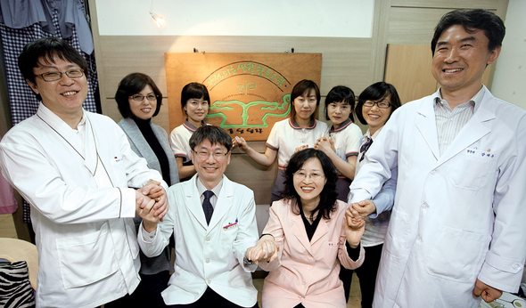 국내 최초의 의료생협으로 15주년을 맞은 안성의료생협 식구들이 병원에서 포즈를 취하고 있다. 가운데 앉아 있는 이들이 이인동·권성실 원장 부부.
