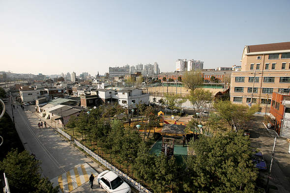 경인전철 철로 너머에서 바라본 배다리 마을의 전경.