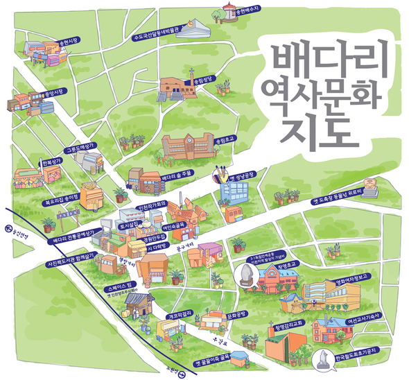 우각로(쇠뿔고개) 아래 배다리에 있는 ‘개코막걸리’의 간판을 바꾸고, 주인 부부의 옛날 사진들을 모아 작은 전시 공간을 만들어놓기도 했다. 개코막걸리의 차림표에는 “월: 월례적으로 마시고… 목: 목이 메어지도록 마시고… 일: 일찍 마시고 내일을 위하여 일찍 잔다”는 글귀 아래에 “죽기를 각오하면 무슨 짓을 못하랴”는 다짐이 적혀 있다. 옛 인천양조장에 터를 잡은 스페이스 빔은 2층을 주민들을 위한 공간으로 상시 제공하기 위해 매주 토요일 영화를 상영하고, ‘배다리송’과 율동을 만들어 방문객에게 ‘전수’하고 있다. 매일 아침 인천시청을 찾아가 도로 건설과 재개발에 반대하는 1인 시위를 벌이는 곽현숙 아벨서점 대표도 힘을 보탰다. 그가 마련한 시집 전시관 겸 문화 사랑방 ‘배다리, 시가 있는, 작은 책길’에서는 매달 마지막주 토요일에 시 낭송회와 우화 낭송회 등을 진행한다.