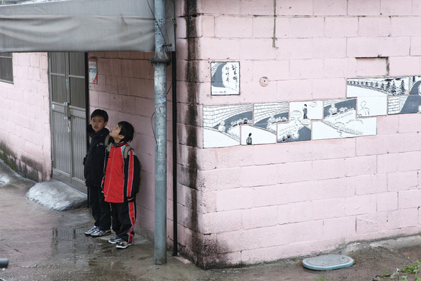 배다리 골목길의 한 처마 아래서 아이들이 빗줄기를 피하고 있다. 건물 벽면에 배다리 관통 산업도로 개설에 반대하는 예술가들이 그려놓은 벽화가 보인다.