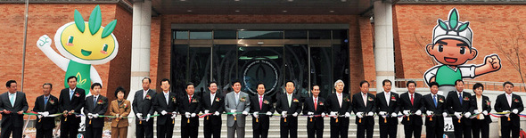 새마을운동 발상지 기념관 준공식 장면. 지난 4월14일 오후 경북 청도군 청도읍 신도1리에서 열린 새마을 운동 발상지 기념관 준공식에서 참석 인사들이 테이프 커팅을 하고 있다. 국민 세금 140억원이 들어가는 거대 사업의 시작이다. 사진 연합