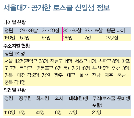 이 자료를 보면, 서울대 신입생들도 <한겨레21>이 보도했던 로스쿨 신입생들의 패턴에서 크게 벗어나지 않음을 확인할 수 있다. 서울대 로스쿨 합격생들의 평균 나이는 27.7살이었고, 주거지는 대다수 다른 대학들과 마찬가지로 서울 관악구-강남구-서초구 순이었다(표 참조).