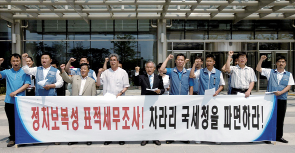 국세청 직원만 보는 인터넷 내부 게시판이 있다. 그 게시판에는 ‘나의 의견’ 난이 마련돼 있다. 직원들끼리 ‘소통’하자는 마당일 터다. 지난 5월28일, 노무현 전 대통령의 서거로 국민들의 추모 열기가 애틋하던 무렵이었다. ‘나의 의견’ 난에 ‘나는 지난여름에 국세청이 한 일을 알고 있다’라는 제목의 글(상자기사 참조)이 올라왔다. 국외 도피 중인 한상률 전 국세청장을 비판하는 내용이었다. 이 글을 근거로 <조세일보> 기자가 ‘노 전 대통령 서거 국세청 직원 비판글’이라는 제목의 기사를 썼다. 국세청은 발끈했다. 글을 쓴 나주세무서의 김동일 계장에 대한 징계위원회를 열어 6월8일자로 직위해제했다. 이날부터 김 계장은 가슴에 검은 리본을 달고 검은 넥타이를 맨 채 출근했다. 국세청 수뇌부가 헌법에 보장된 표현의 자유에 사망선고를 내렸다는 생각에서였다.