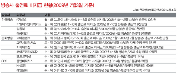 방송사 출연료 미지급 현황 (※ 이미지를 클릭하면 크게 볼 수 있습니다)