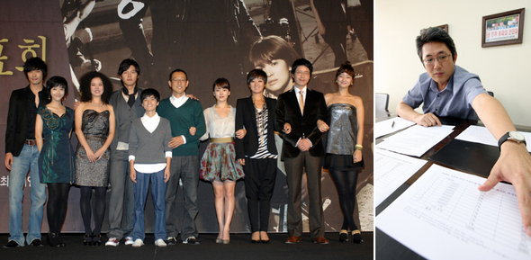 지난해 10월 한국방송 월·화 드라마 <그들이 사는 세상>의 제작발표회 모습(왼쪽). 이 드라마 출연자들은 10억원의 출연료를 지급받지 못했다. 출연료 미지급 현황을 설명하고 있는 한국방송영화공연예술인노동조합의 김응석 위원장. 사진 왼쪽부터 한국방송 제공·<한겨레21> 정용일 기자