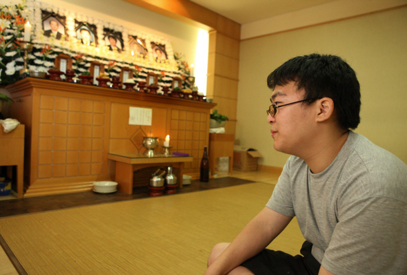 아빠의 주검이 아무런 부담 없이 땅에 묻힐 날은 언제일까? 학교를 다녀온 윤상필군이 7월14일 저녁 서울 한남동 순천향대병원 영안실에 말없이 앉아 있다. 사진 <한겨레21> 정용일 기자