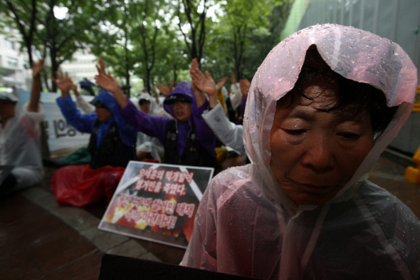 용산철거민참사범국민대책위원회 회원들과 유가족들이 7월15일 낮 서울시청 별관 옆에서 용산 참사의 진실을 밝히고 미공개 수사기록 3천여 쪽을 공개할 것을 촉구하는 집회를 열고 있다. 오세훈 서울시장은 이날 별다른 언급이 없었다. 사진 <한겨레21> 류우종 기자