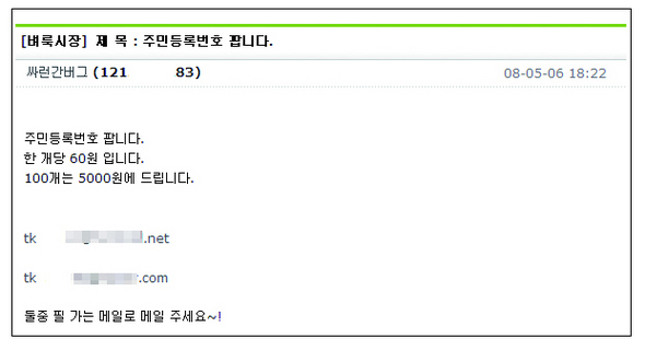 중국 옌볜 조선족자치주의 웹사이트 ‘장터’ 게시판에서는 “해킹 가능한 분 연락 달라. 게임 사이트 아이디와 비밀번호 뽑아줄 수 있는 분, 고수익 보장한다”는 내용의 글이 발견됐다. 중국어 최대 포털 사이트인 ‘바이두’의 커뮤니티를 살펴봐도 “DDoS(분산서비스거부) 공격을 수행할 해커를 구한다”는 게시물을 찾기 어렵지 않다. 또한 “해킹 툴을 판다”는 게시물도 여럿이다. ‘장터’에서는 “주민등록번호 팝니다”라는 글도 발견할 수 있다. 게시자는 “주민등록번호를 1개당 60원, 100개에 5천원에 드린다”고 설명했다. 한국에서 유출된 대량의 주민등록번호 정보는 이렇게 ‘돈’으로 환산된다.