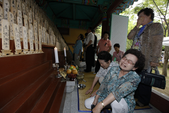지난 8월6일 경남 합천군 합천원폭피해자 복지회관에 마련된 위령각을 찾은 원폭 피해자 1·2세들이 눈물을 흘리고 있다.