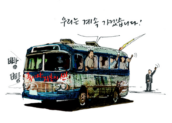 알다시피 그는 세 가지 지향점을 제시했다. 그런데 그중 하나는 모호하게 남아 있는 것 같다. 동향인들과 얘기를 하다 보면, ‘민주주의’와 ‘남북관계’에는 유달리 예민한 감수성을 가지는 반면, ‘서민 경제’에는 별다른 관점이 없는 경우를 자주 만난다. 민주당과 한나라당도 경제정책에서는 뚜렷한 변별점이 없는 것 같다. 하지만 호남 사람들의 요구의 본질이, 우리도 저만큼 큰 자동차를 타야 한다는 것이었다고는 믿기 어렵다. 전라도가 ‘사회적 경제’의 모종밭이 되기를 서민 경제의 내용이 혁신적으로 채워지지 않는다면 민주주의도 어렵다. 따지고 보면, 최근 민주주의의 파괴도 유권자들의 경제적 탐욕에서 비롯된 것이 아닌가. 나는 전라도가 ‘사회적 경제’나 ‘호혜적 경제’라고 불릴 만한 것의 모종밭이 되기를 바란다. 그것을 민주당이 실천할 수 없다면, 민주당을 버리면서 나아가야 한다. 함께 탄 버스가 저항과 침묵의 지점을 지났는데, 그 버스를 기념관에 보관하기 위해 세워야 한다면, 그것은 너무 안타깝지 않은가. 이찬웅 프랑스 리옹고등사범학교 철학박사과정