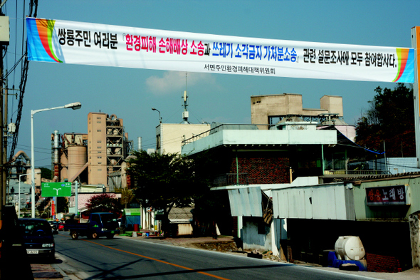 강원 영월군 서면 쌍용리 시가지. 쌍용양회 영월공장이 들어선 뒤 조성된 시가지인 탓에 공장에 바싹 붙어 있다. 현수막은 서면 지역의 새로운 분쟁을 예고한다.