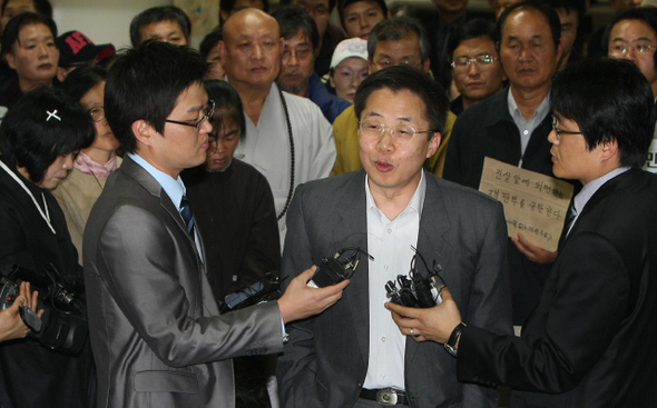 ‘용산 참사’ 선고 공판이 진행되던 지난 10월28일 오후 2시30분 서울중앙지법 311호 중법정, 판결문 낭독을 듣고 있던 김주환 전국철거민연합 신계철거대책위원회 위원장이 피고인석에서 일어섰다. 이충연 용산4구역철거민대책위원회 위원장과 김형태 변호사도 동시에 몸을 일으켜 법정을 빠져나가려 했다. 법정 방호원들은 날랜 몸짓으로 이들의 돌발 행동을 저지하기 위해 몰려들었다.
