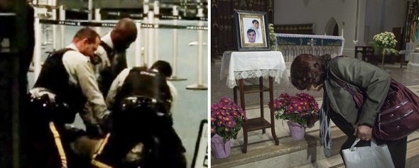 2007년 10월14일 캐나다 밴쿠버공항 입국장에서 전자충격기에 맞아 쓰러진 폴란드계 이민자 로버트 지에칸스키를 공항경찰들이 붙잡고 있는 장면을 담은 비디오 화면. 현장 목격자들은 아무런 저항도 하지 않는 지에칸스키에게 경찰이 다짜고짜 전자충격기를 발사했다고 증언했다(왼쪽). 지난 10월14일 지에칸스키의 2주기 추모미사를 앞두고 밴쿠버 시내 성 로자리 대성당에서 어머니 소피아 치소프스키가 영정 앞에 화분을 놓고 있다. (왼쪽부터) REUTERS·REUTERS/ ANDY CLARK