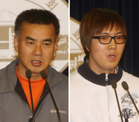 쌍용차 해고노동자 김정우(왼쪽)씨는 “지난 8월 노사 대타협 이후 수많은 쌍용차 노동자들이 비참한 삶을 살고 있다는 것을 알아주면 좋겠다”며 “도와주세요”라고 간청했다. 쌍용차 비정규직 노동자로 해고된 유제선(31)씨는 “평택 지역의 아웃소싱 업체 수십 곳이 담합해 쌍용차 해고자는 절대 받지 말도록 하고 있다”고 주장했다.