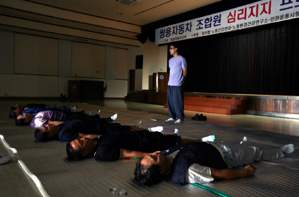 쌍용자동차가 노사 간 대타협으로 정상화를 맞은 지 한 달째가 되는 9월5일 오전 경기 평택시청 대회의실에서 파업 기간 심리적·육체적으로 피폐해진 노조원들이 강사의 도움으로 심리치료를 받고 있다. 한겨레 이종근 기자