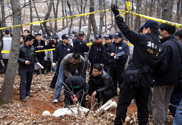 경기 서남부 연쇄살인 사건을 저지른 강호순씨가 지난 2월2일 안산 부곡동 야산에서 이뤄진 현장검증에서 피해자의 주검을 유기하는 모습을 재연하고 있다. 한겨레 신소영 기자