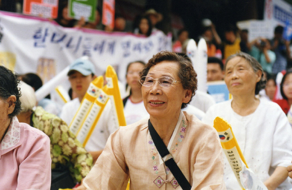2008년 여름 서울 일본대사관 앞에서 열린 수요집회에 참가한 일본군 위안부 피해자 고 김순악 할머니의 모습. 김순악 할머니는 2000년 피해자 인정을 받은 뒤 수요 집회 등에 단골로 참석했다. 정신대 할머니와 함께하는 시민모임’ 제공