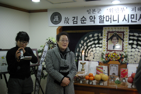 고 김순악 할머니의 장례식은 대구 지역 일본군 위안부 피해자를 돕고 있는 곽병원에서 치러졌다. 지난 1월3일, 동갑내기 친구로 지냈던 이용수 할머니(가운데)가 문상을 왔다. ‘정신대 할머니와 함께하는 시민모임’ 제공