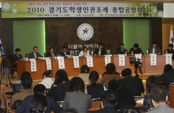 지난 1월19일 오후 2시, 경기도교육청 제1회의실에서 학생인권조례 종합공청회가 열렸다. 경기도 학생인권조례제정 자문위원회(이하 자문위)가 조례 초안을 내놓은 뒤(<한겨레21> 794호 표지이야기 참조) 찬반 의견의 수렴에 나선 것이다. 이번 공청회는 자문위가 준비한 세 차례의 공청회 중 첫 번째 자리였다.