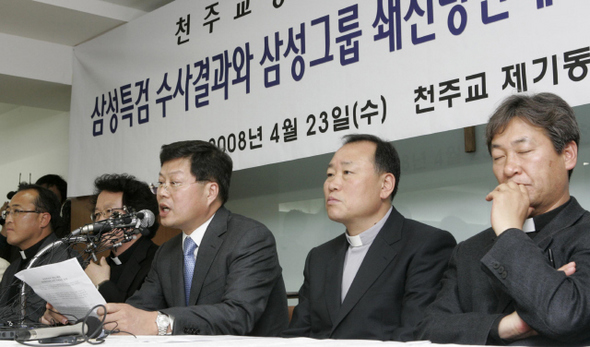 김용철 변호사와 천주교정의구현전국사제단 신부들이 지난 2008년 4월 서울 동대문구 제기동 성당에서 기자회견을 열어 삼성 특검의 수사 결과와 삼성이 발표한 경영 쇄신안을 비판하고 있다. 한겨레 김진수 기자