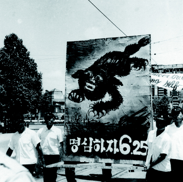 1953년 6·25 거리 행진에서 학생들이 북의 지도를 악마로 변형한 포스터를 들고 있다. 한겨레 자료